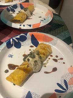 savory pumpkin lefse rollups with smoky squash chikun & roasted garlic, artichoke kreem, caper dill relish, spruce bouillon reduction